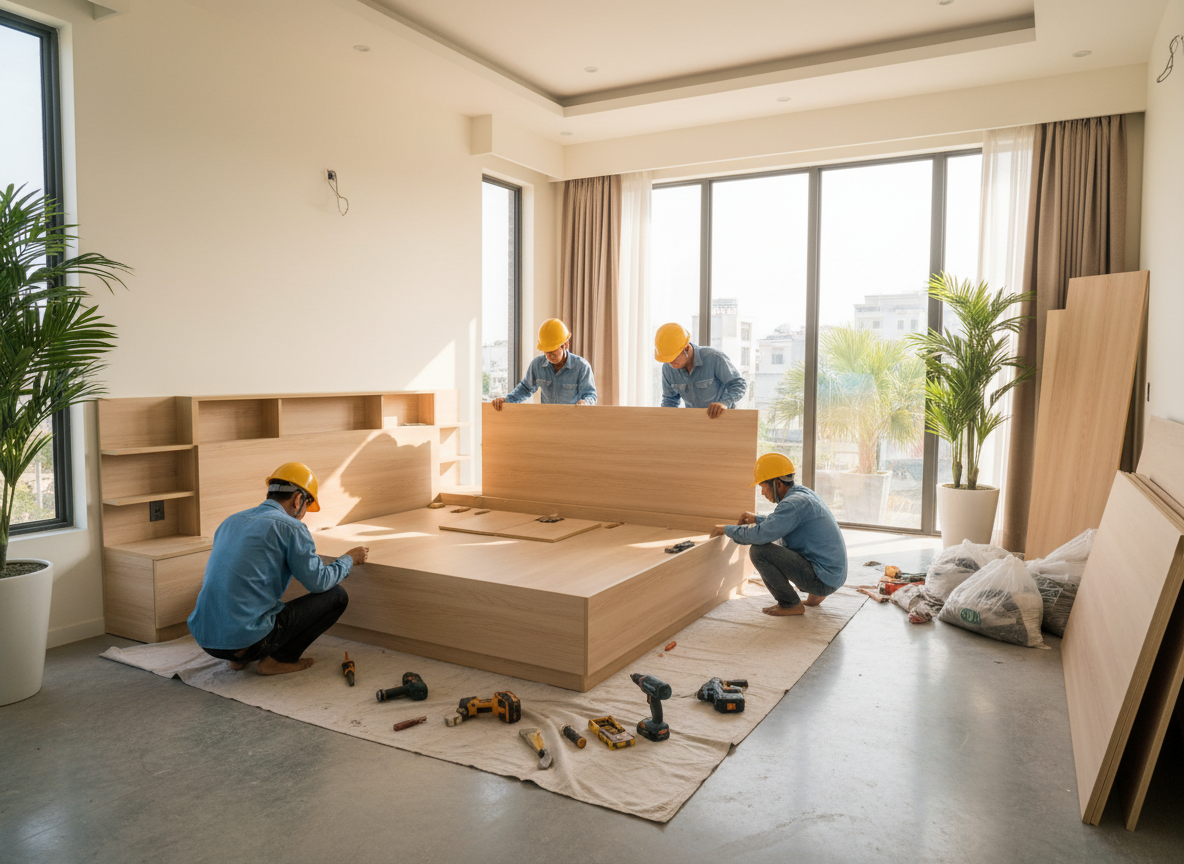Lắp đặt nội thất, kiểm tra kỹ hệ phụ kiện, hoàn thiện sơn, phủ melamine/laminate/veneer… đảm bảo độ phẳng – độ bền – độ thẩm mỹ cao nhất.
