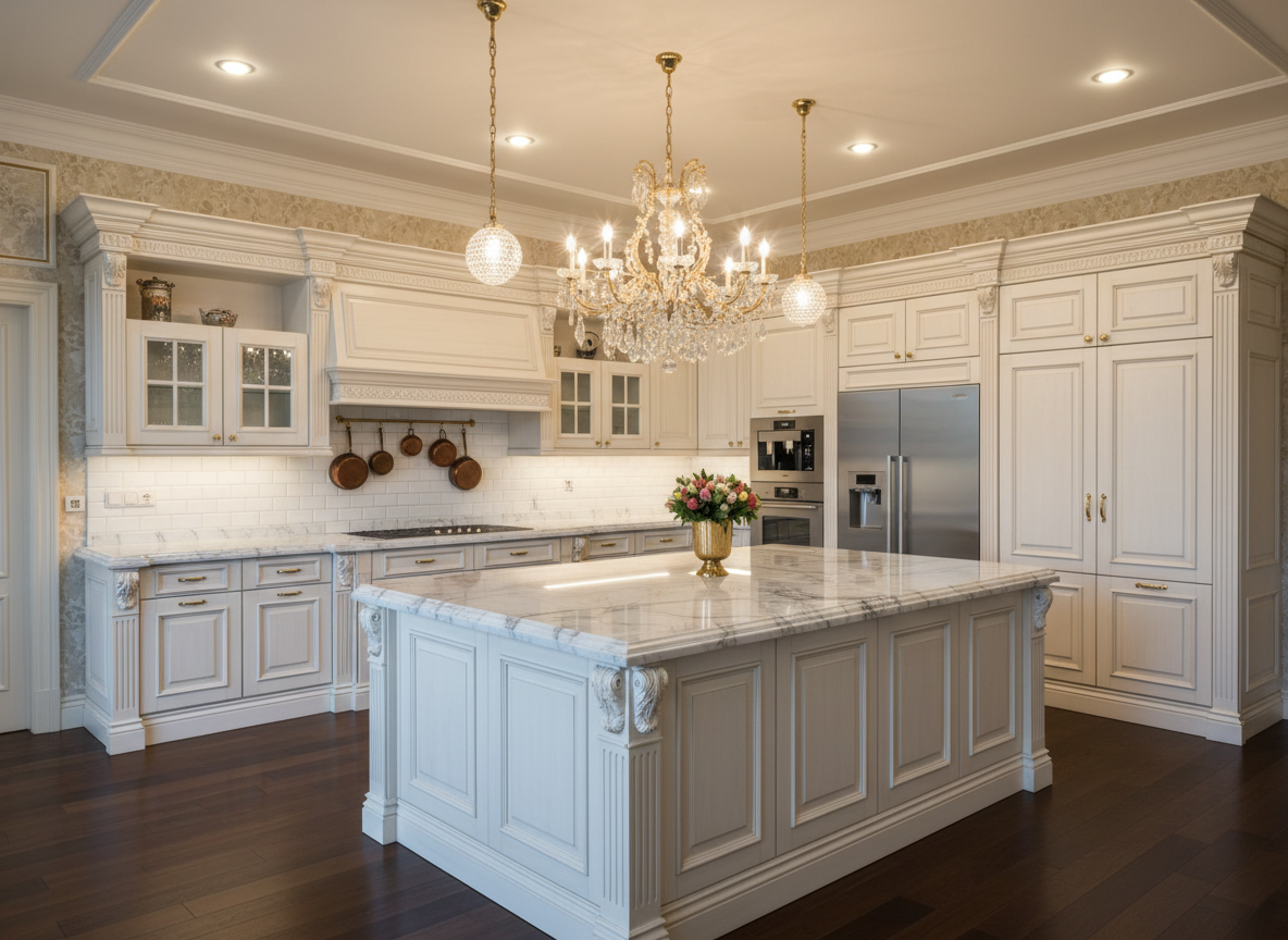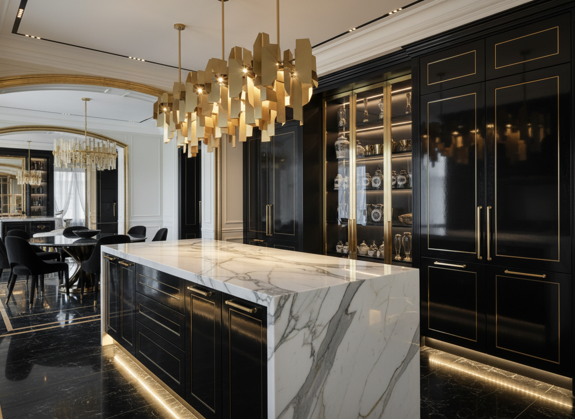 Luxury tập trung vào sự xa hoa, cầu kỳ, sử dụng đá tự nhiên, gỗ quý, kim loại mạ vàng, thiết bị nhập khẩu cao cấp. Thi công nội thất phòng bếp biệt thự phong cách Luxury đòi hỏi tay nghề thợ cực cao và quy trình giám sát nghiêm ngặt.