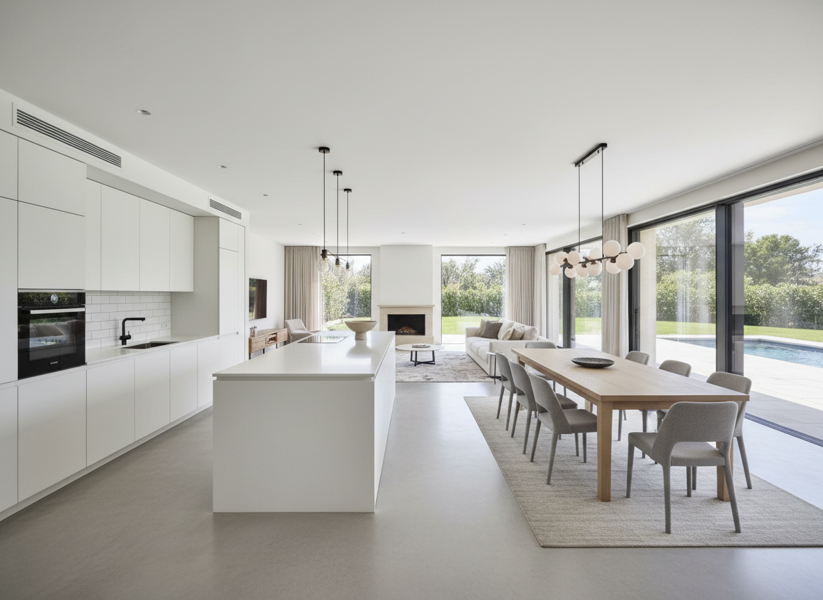 Thi công nội thất phòng bếp biệt thự hiện đại chú trọng vào đường nét tối giản, màu sắc trung tính, bố cục khoa học, thiết bị thông minh. Đây là phong cách được nhiều gia đình trẻ, biệt thự phố, biệt thự nghỉ dưỡng ưa chuộng.