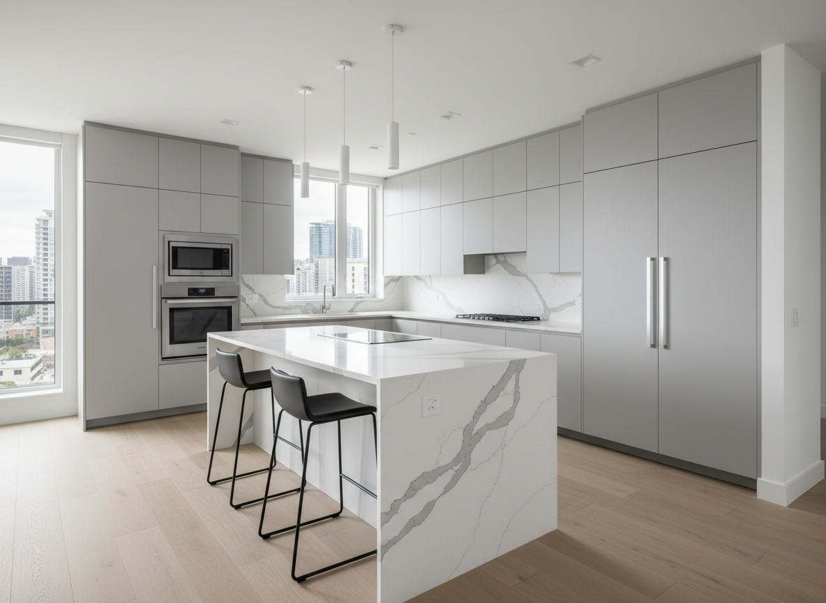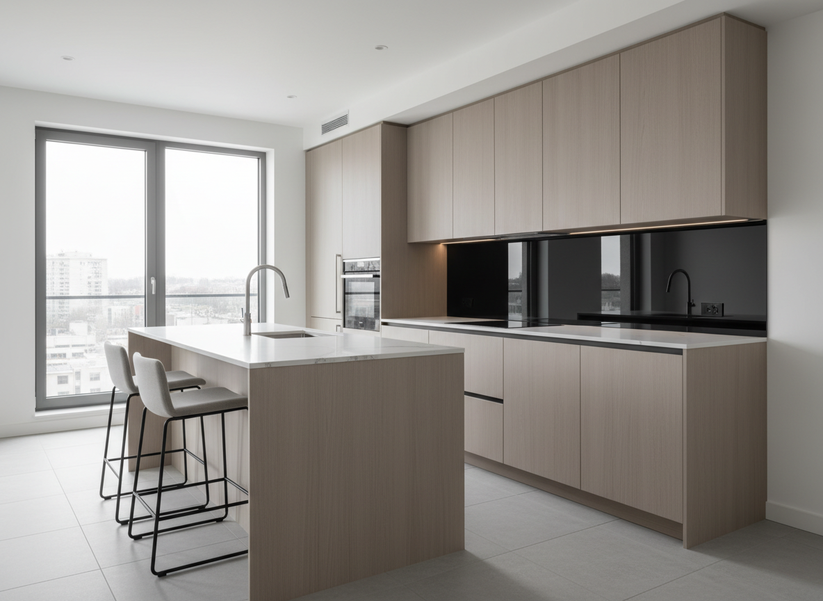Hiện nay, xu hướng thi công nội thất phòng bếp chung cư đang hướng đến sự tối giản, hiện đại nhưng vẫn đề cao tính tiện nghi và cá nhân hóa. Tủ bếp phẳng không tay nắm, bề mặt phủ acrylic bóng gương hoặc laminate vân gỗ đang rất được ưa chuộng bởi mang lại vẻ đẹp sang trọng, dễ vệ sinh.