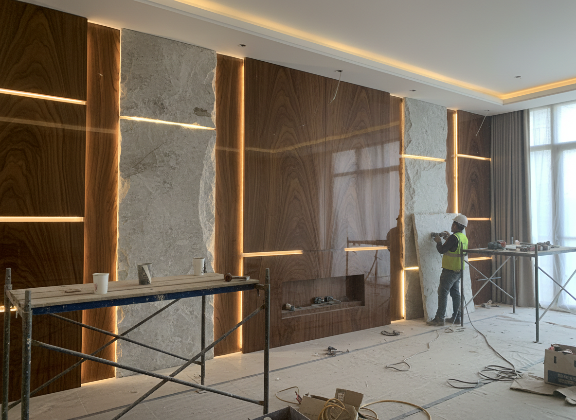 Thi công hệ tường ốp gỗ, ốp đá, sơn hiệu ứng, giấy dán tường.