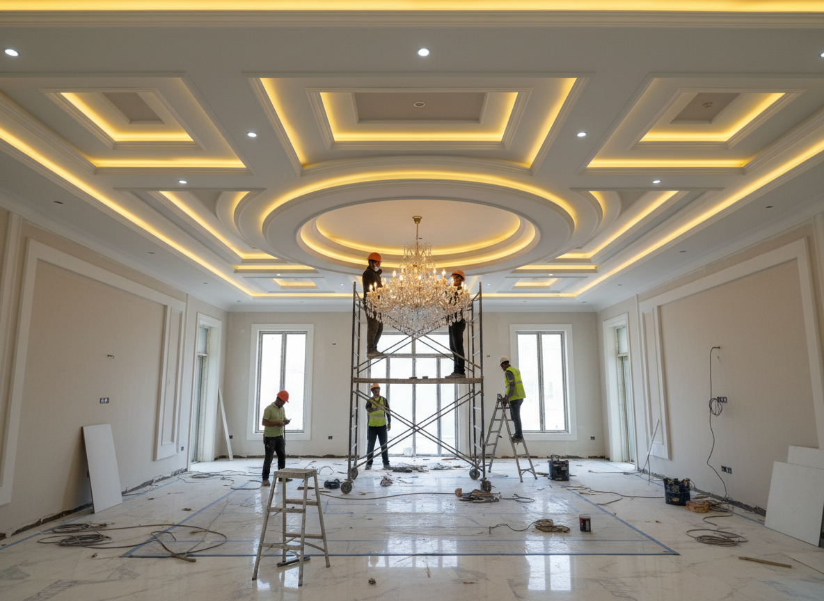 Thi công hệ thống chiếu sáng, đèn chùm, đèn hắt trần, đèn trang trí.