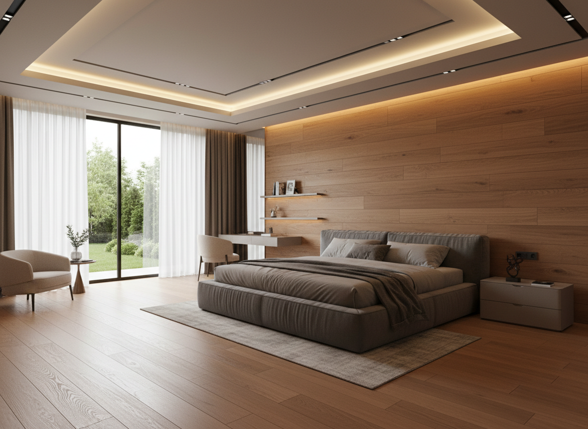 Vách ốp đầu giường, trần thạch cao giật cấp, sàn gỗ tự nhiên hoặc sàn gỗ công nghiệp cao cấp là những hạng mục tạo điểm nhấn cho phòng ngủ biệt thự.