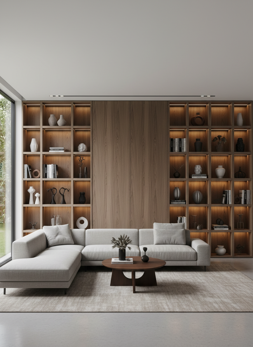 Bao gồm sofa, bàn trà, kệ tivi, tủ lưu trữ, kệ sách, tủ trưng bày rượu, kệ decor… Các hạng mục này thường được sản xuất theo kích thước thực tế tại xưởng để đảm bảo độ chính xác và thẩm mỹ cao.