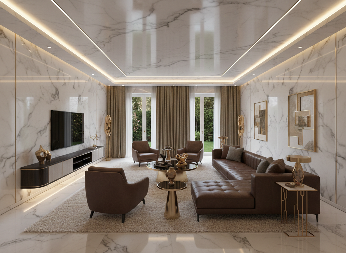Sàn có thể sử dụng gỗ tự nhiên, gỗ công nghiệp cao cấp, đá marble hoặc đá porcelain khổ lớn. Sàn không chỉ ảnh hưởng đến thẩm mỹ mà còn tác động trực tiếp đến cảm giác di chuyển, độ an toàn và khả năng vệ sinh.