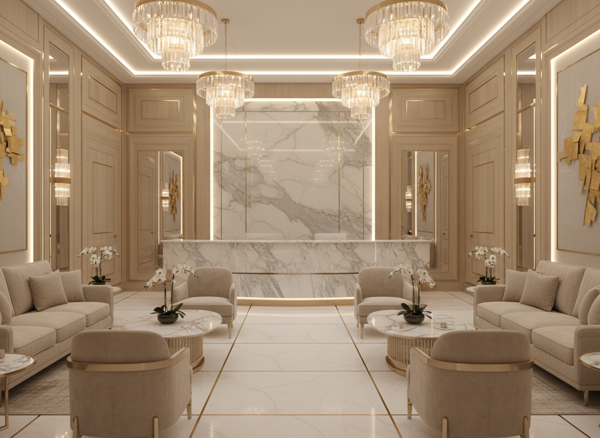 Quầy lễ tân là bộ mặt của spa, là nơi tiếp đón và tạo ấn tượng đầu tiên với khách hàng. Trong thi công nội thất spa cao cấp, quầy lễ tân thường được thiết kế nổi bật với vật liệu đá marble, gỗ veneer, kim loại mạ vàng, kết hợp ánh sáng gián tiếp sang trọng. Kích thước quầy được tính toán chuẩn công năng, tiện lợi cho nhân viên làm việc và khách hàng giao dịch.