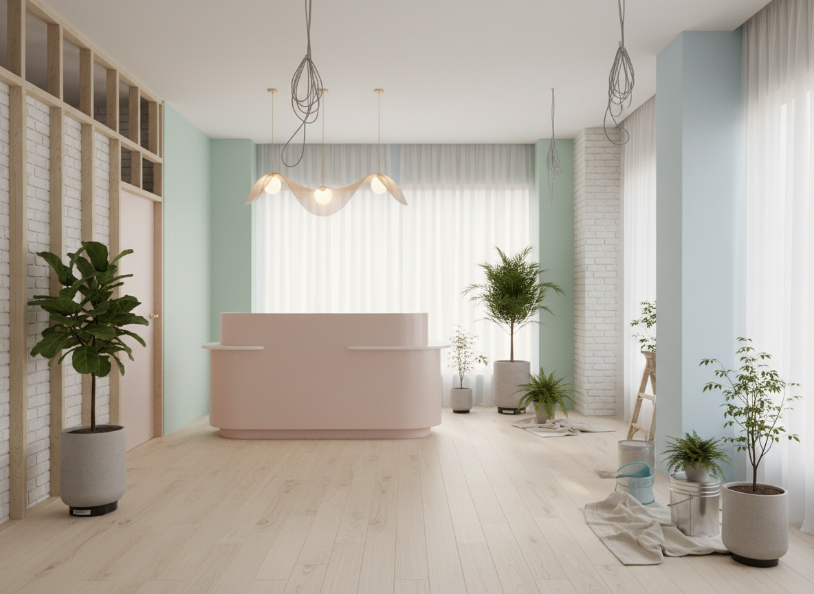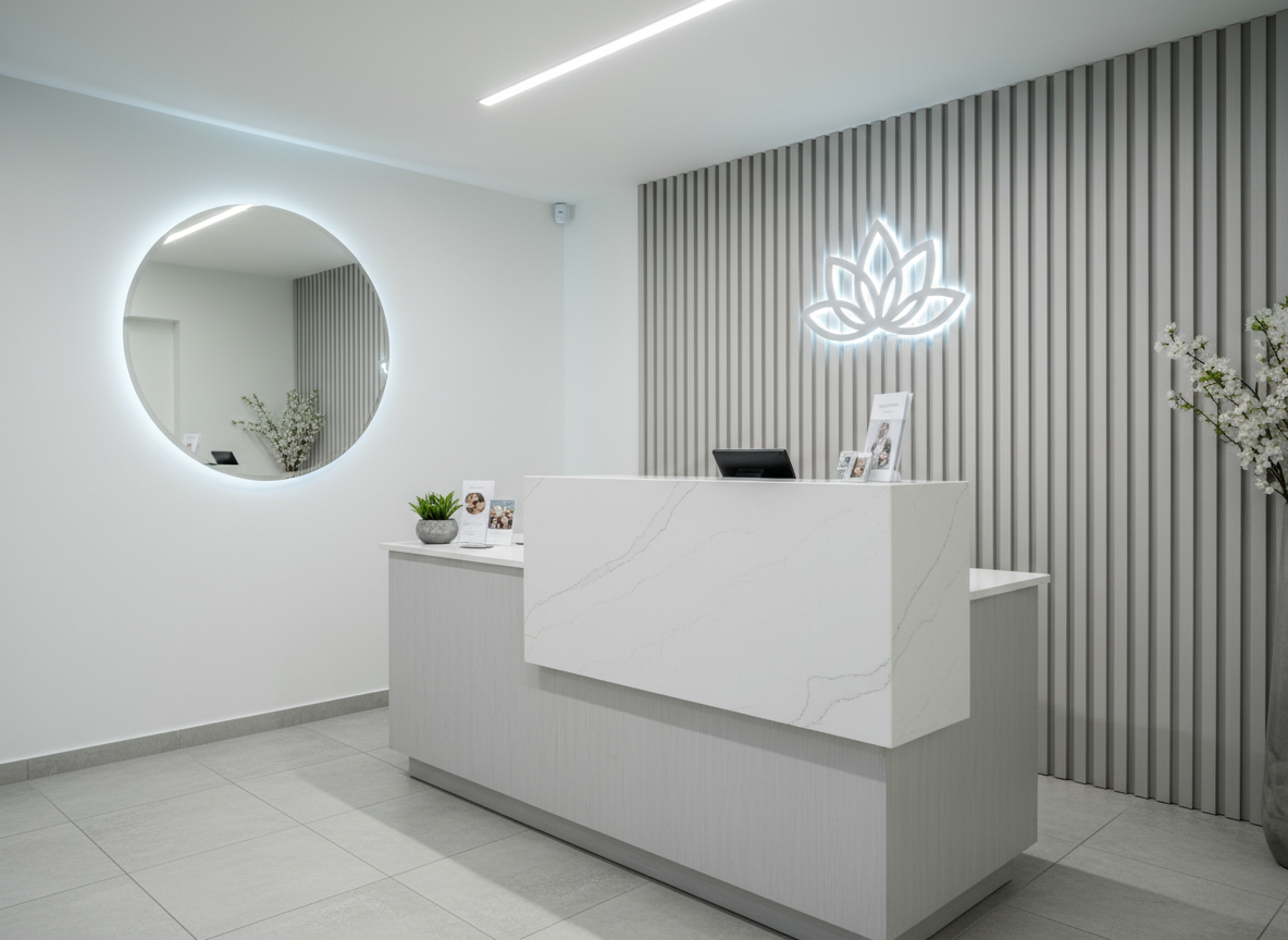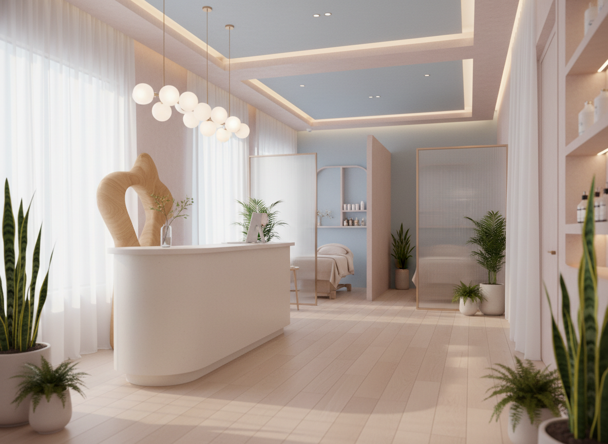 Quầy lễ tân và khu vực tiếp khách: Đây là bộ mặt của spa, nơi tạo ấn tượng đầu tiên với khách hàng. Quầy lễ tân cần được thi công đẹp, gọn, bố trí hợp lý, dễ quan sát và thuận tiện cho nhân viên tư vấn.