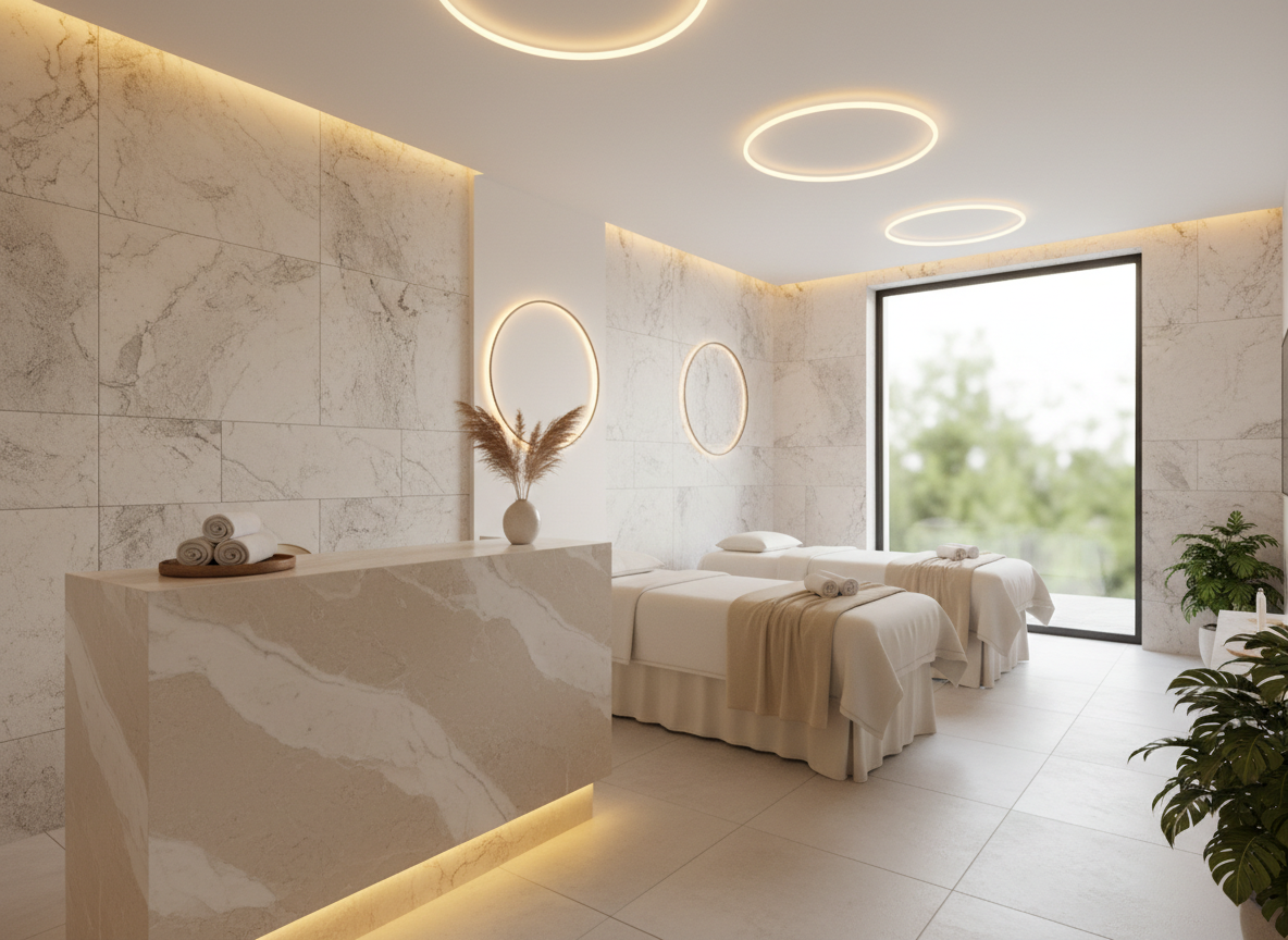 Hệ thống ánh sáng và trang trí: Ánh sáng trong spa mini không nên quá gắt, ưu tiên ánh sáng vàng ấm kết hợp đèn trang trí tạo chiều sâu và cảm giác thư giãn.