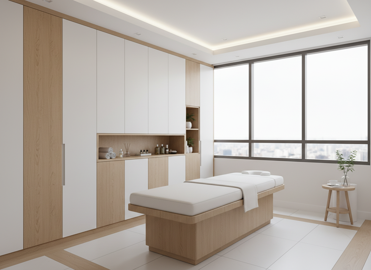 Phong cách hiện đại: Sử dụng đường nét gọn gàng, màu sắc trung tính, ánh sáng LED tinh tế, giúp không gian spa mini trở nên rộng rãi, sang trọng và phù hợp với nhóm khách hàng trẻ.