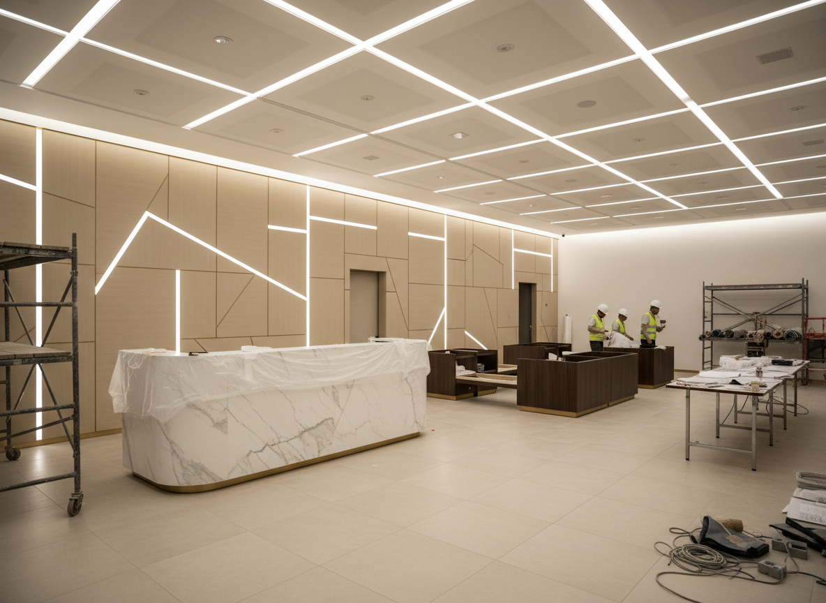 Thi công hệ thống đèn trang trí, đèn led hắt trần, hắt tường tạo không gian thư giãn.