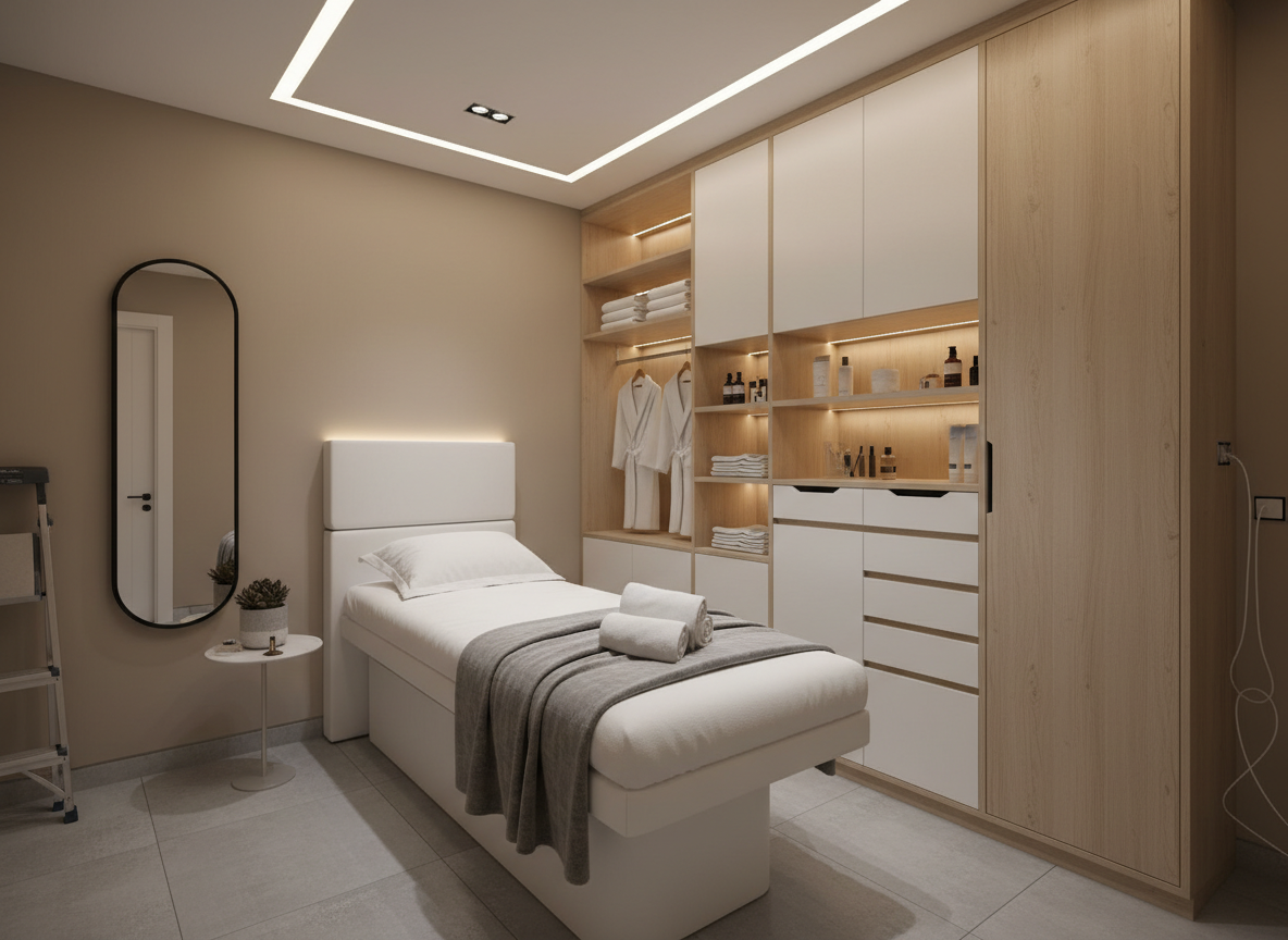 Trong năm 2025, xu hướng thi công phòng chăm sóc da tập trung mạnh mẽ vào yếu tố cá nhân hóa không gian, tối ưu trải nghiệm khách hàng và ứng dụng công nghệ thông minh. Các phòng chăm sóc da hiện đại không chỉ đẹp về mặt thẩm mỹ mà còn được tích hợp hệ thống đèn thông minh, âm thanh thư giãn, điều hòa tự động và hệ thống lọc không khí cao cấp.