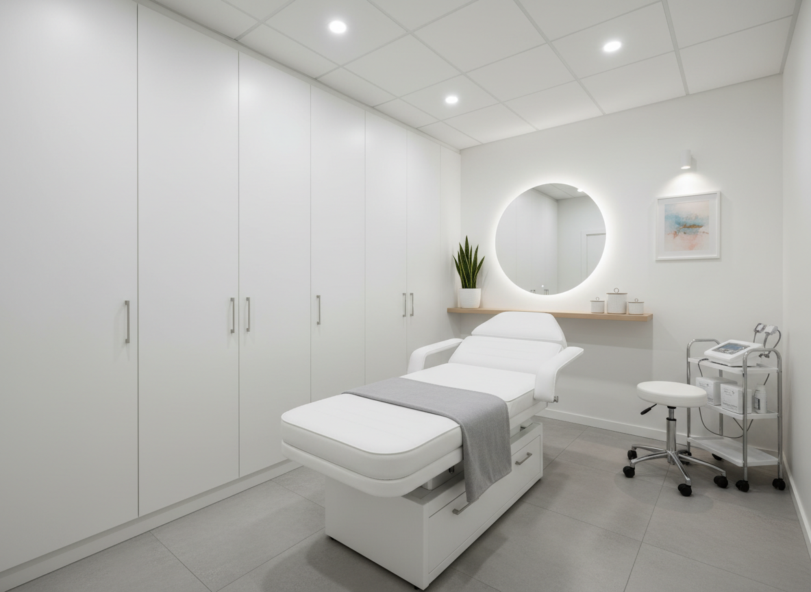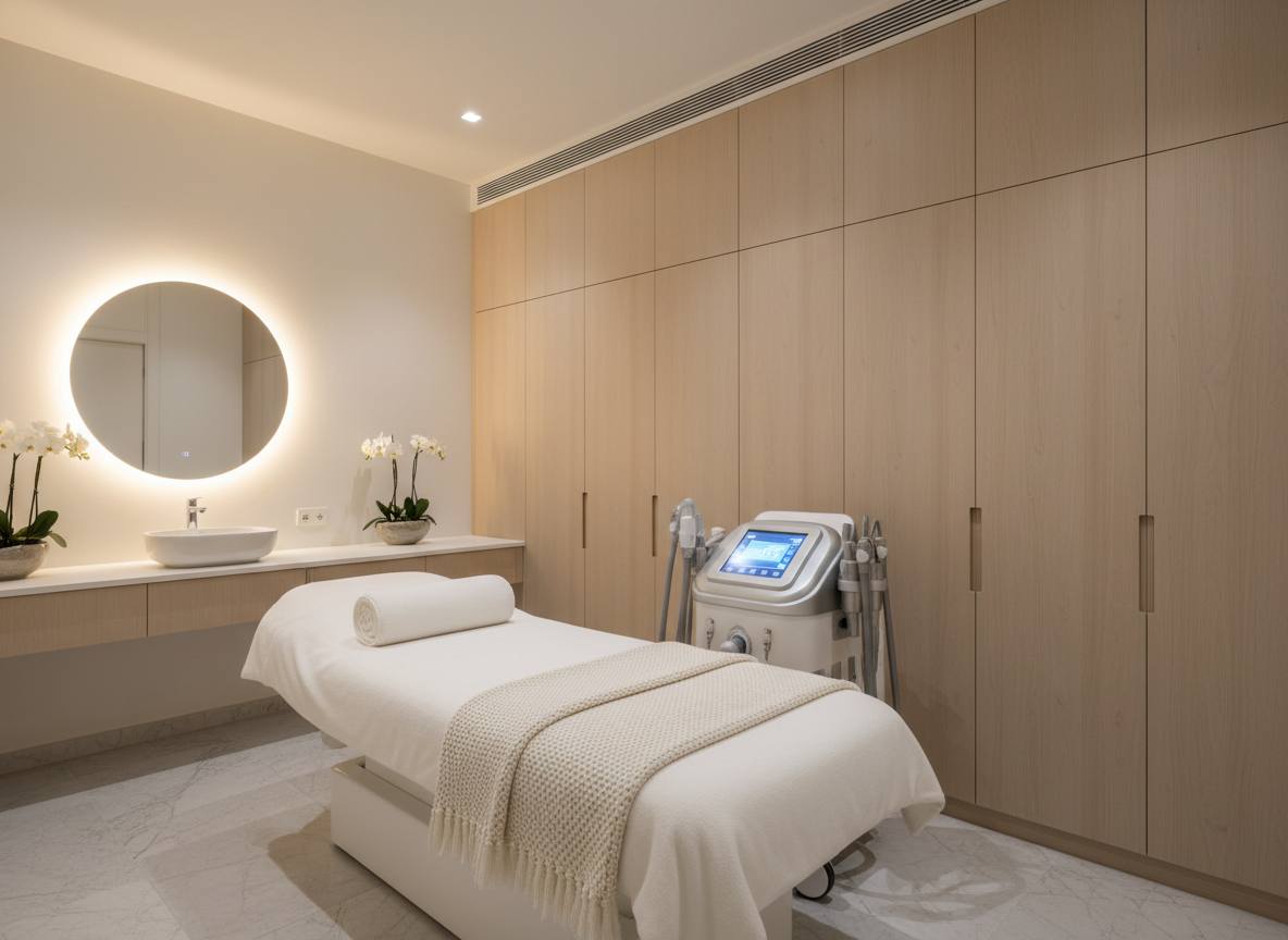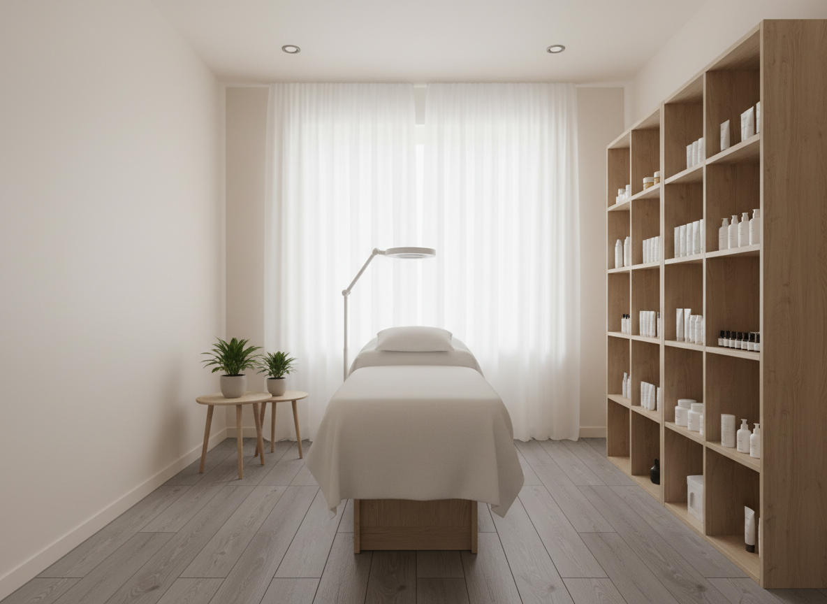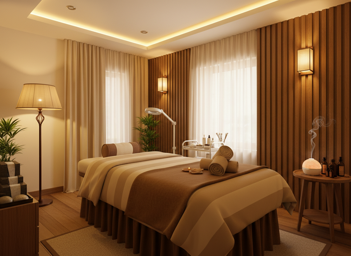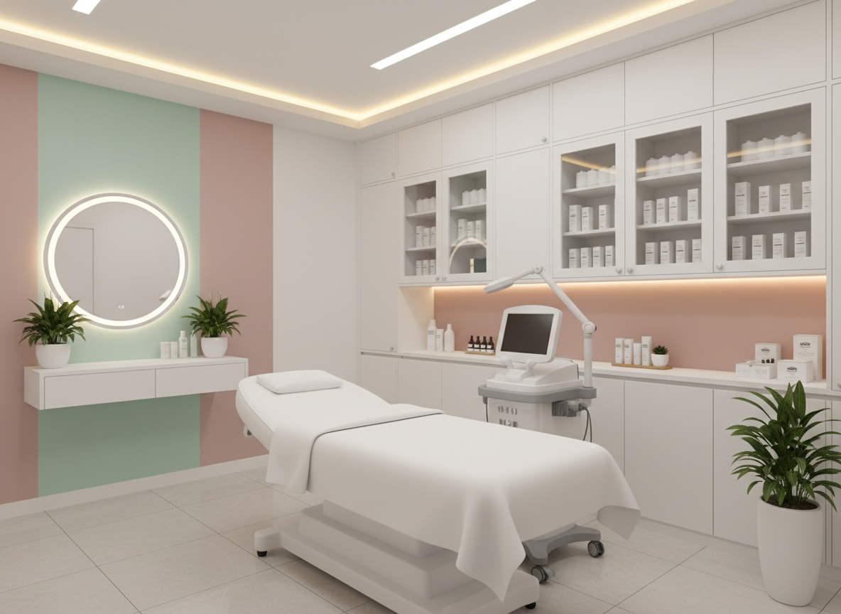 Về ánh sáng, cần kết hợp hài hòa giữa ánh sáng tự nhiên và ánh sáng nhân tạo. Đèn chiếu sáng trong phòng điều trị da thường sử dụng ánh sáng trắng trung tính 4000K – 5000K để kỹ thuật viên quan sát da chính xác nhưng không gây chói mắt. Ngoài ra, hệ thống đèn trang trí dịu nhẹ giúp tạo cảm giác thư giãn cho khách hàng trong suốt quá trình trị liệu.