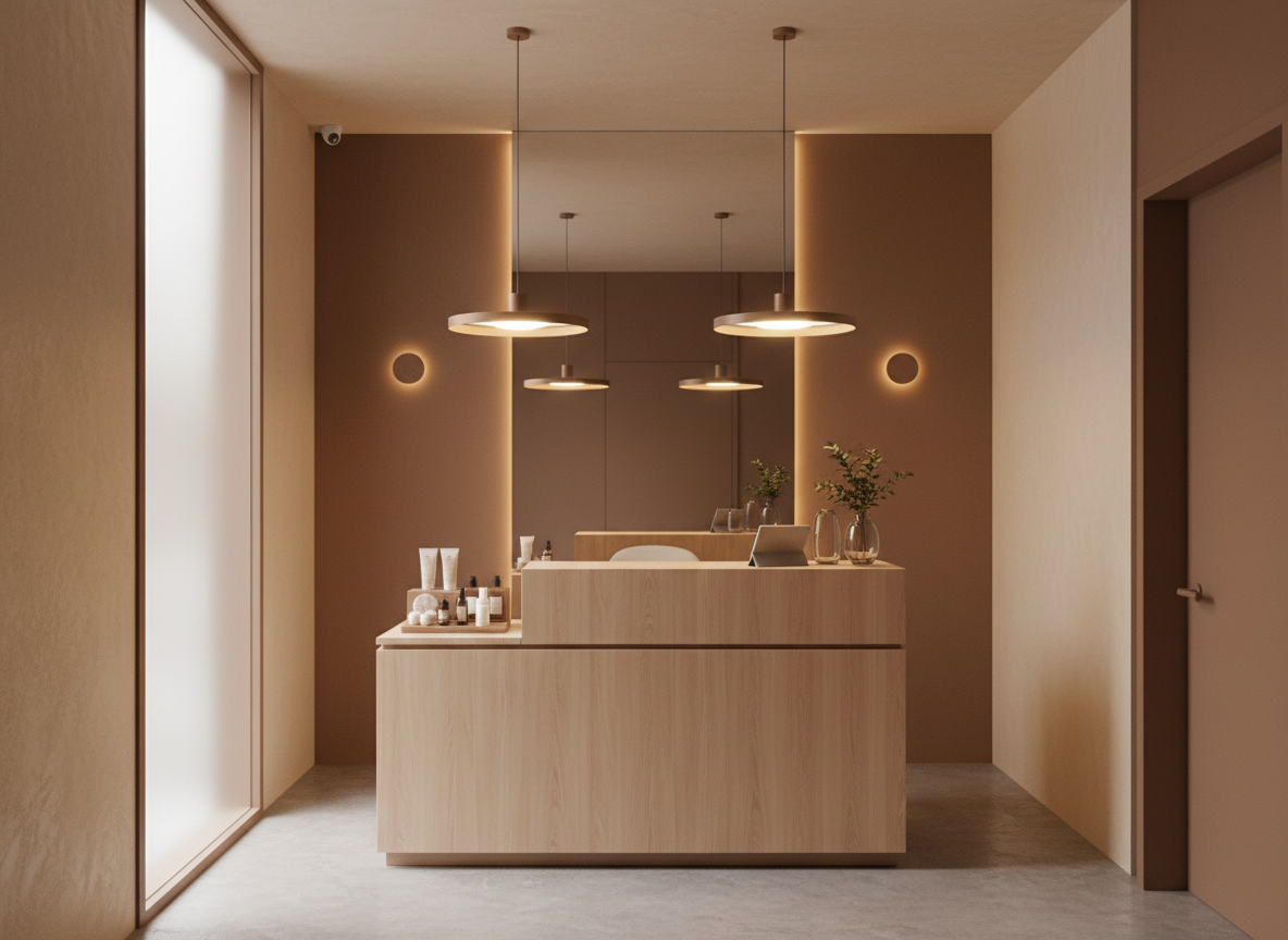 Thường áp dụng cho spa thẩm mỹ, sử dụng vật liệu đá, gương, kim loại mạ, ánh sáng tinh tế để nâng tầm thương hiệu.