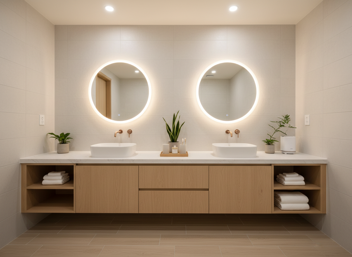 Đây là khu vực yêu cầu cao về kỹ thuật thi công, đặc biệt là hệ thống chống ẩm, cách âm, cấp thoát nước và an toàn điện. Phong cách Hàn Quốc ưu tiên không gian ấm áp, ánh sáng mờ ảo, tạo cảm giác thư giãn tuyệt đối cho khách hàng.