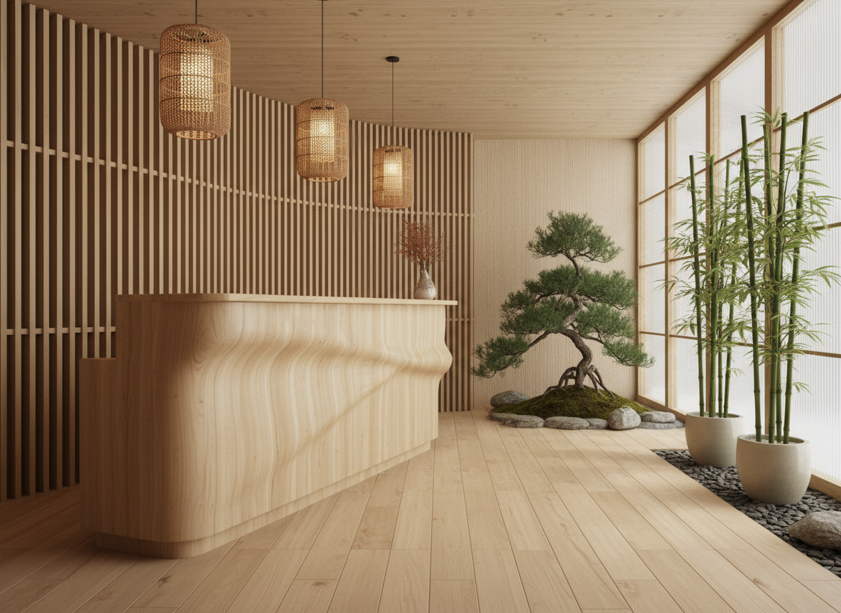 Trong quá trình thi công spa phong cách Nhật Bản, mỗi hạng mục đều có vai trò quan trọng trong việc tạo nên sự hoàn hảo cho tổng thể không gian. Khu vực sảnh đón tiếp thường được thiết kế tối giản với quầy lễ tân bằng gỗ, ánh sáng dịu nhẹ, hương thơm tinh dầu thiên nhiên và điểm nhấn là mảng tường đá, tường gỗ hoặc tranh phong cảnh Nhật Bản.