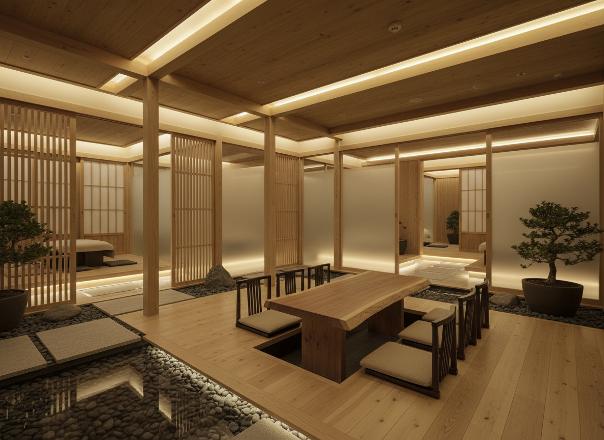 Khu vực phòng xông hơi, onsen hoặc thủy liệu nếu có sẽ yêu cầu tiêu chuẩn kỹ thuật cao về chống thấm, thông gió, cấp thoát nước và an toàn điện. Việc lựa chọn vật liệu chịu nhiệt tốt, không trơn trượt, dễ vệ sinh là yếu tố bắt buộc trong thi công spa phong cách Nhật Bản chuyên nghiệp.