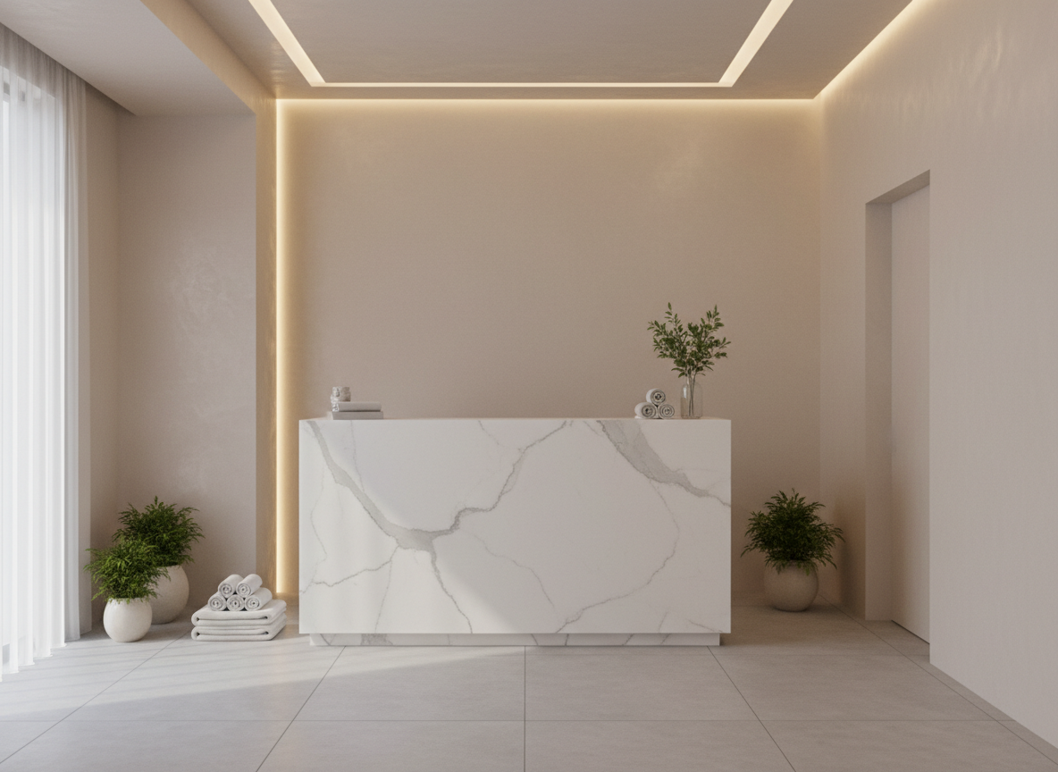 Quầy lễ tân trong spa tối giản thường có thiết kế gọn gàng, sử dụng màu sắc đồng nhất với tổng thể không gian, kết hợp ánh sáng gián tiếp để tạo điểm nhấn nhẹ nhàng. Khu vực chờ được bố trí ghế đơn giản, ít chi tiết, ưu tiên sự thoải mái và khoảng trống di chuyển. Phòng trị liệu và massage hạn chế tối đa đồ nội thất không cần thiết, chỉ giữ lại những hạng mục phục vụ trực tiếp cho liệu trình, giúp không gian luôn thông thoáng và sạch sẽ.