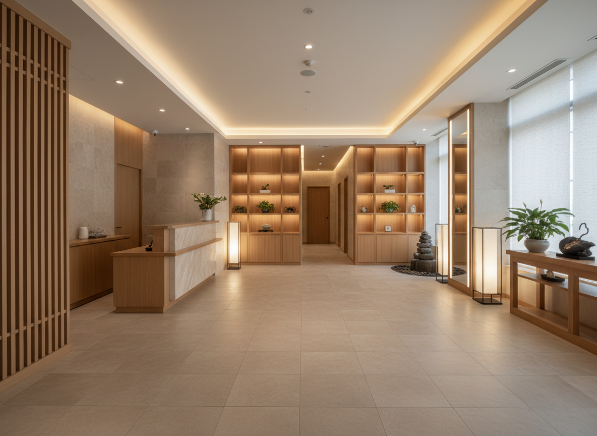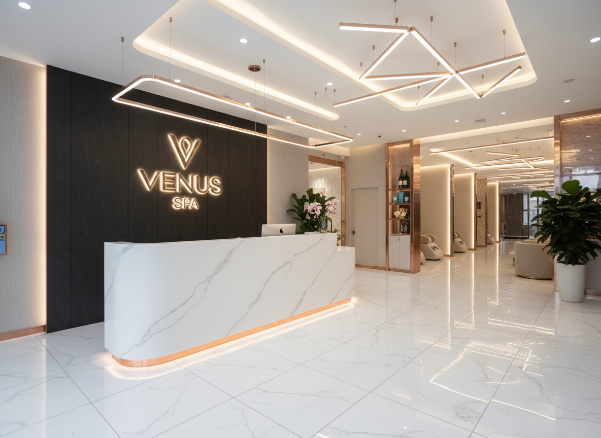 Spa phong cách hiện đại cao cấp, sử dụng tông màu trung tính, ánh sáng gián tiếp, vật liệu đá, gỗ, kim loại mạ tinh tế.