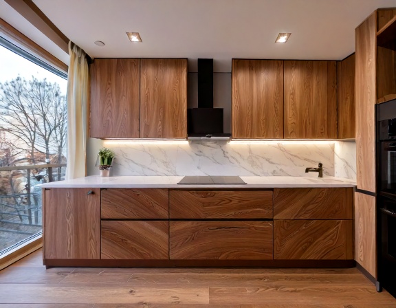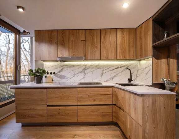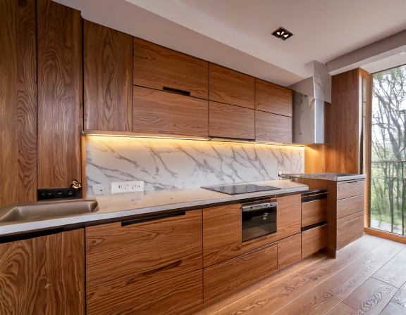 Gỗ tự nhiên như gỗ sồi, gỗ xoan đào, gỗ óc chó mang lại vẻ đẹp ấm cúng, đẳng cấp và độ bền cao theo thời gian. Những bộ tủ bếp gỗ tự nhiên thường được xử lý sấy kỹ, tẩm chống mối mọt để hạn chế co ngót, nứt nẻ trong điều kiện khí hậu nóng ẩm tại Việt Nam.