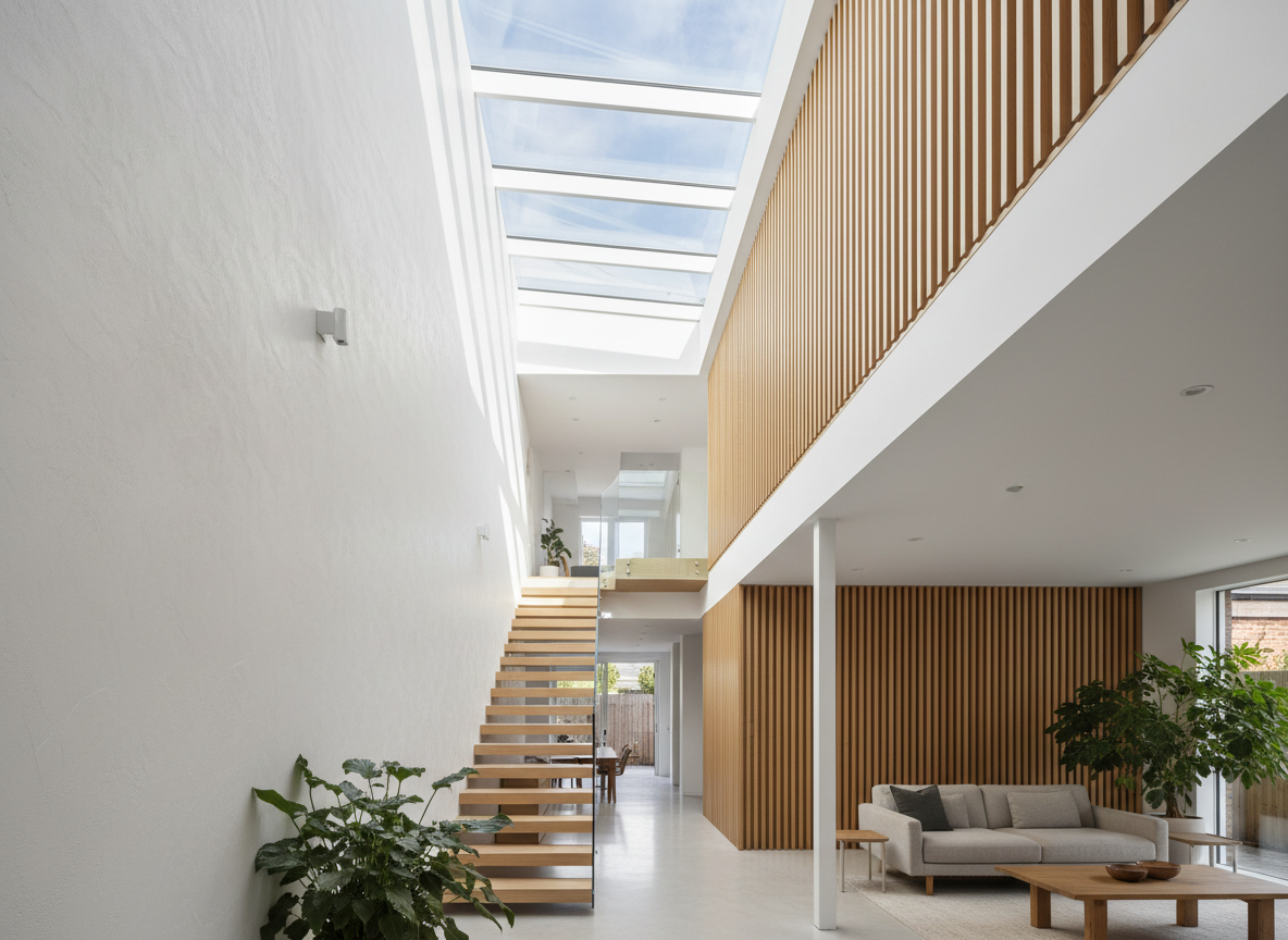 Ánh sáng trắng mạnh dễ gây mỏi mắt và mất cảm giác ấm cúng. Nhà phố hiện đại ưu tiên ánh sáng vàng – trung tính.