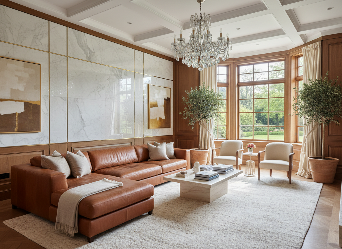 Một bộ sofa chất lượng cao từ da thật hoặc nỉ cao cấp kết hợp bàn trà đá Marble, khung kim loại mạ vàng sẽ tôn lên sự sang trọng. Kích thước sofa cần cân đối với diện tích phòng để không gây chật chội.
