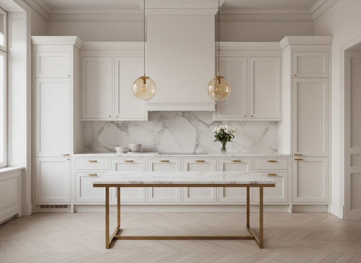 Tủ bếp thường sử dụng MDF chống ẩm sơn PU hoặc gỗ tự nhiên, phào chỉ nhẹ nhàng, tay nắm kim loại mạ vàng hoặc mạ đồng. Tủ bếp màu trắng – kem – navy đang rất phổ biến vì dễ kết hợp và tạo cảm giác sạch sẽ.