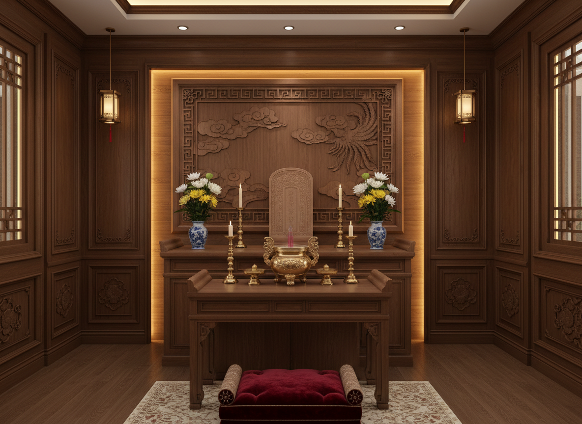 Sử dụng gỗ tự nhiên kết hợp đèn âm trần và hoa văn nhẹ nhàng, phòng thờ mang nét trang nghiêm nhưng vẫn sang trọng, phù hợp văn hoá Việt Nam.