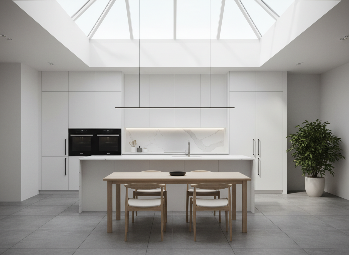 Ưu tiên tường phẳng, trần phẳng, tủ phẳng không tay nắm. Các không gian nên liên kết với nhau bằng màu sắc, vật liệu giống nhau để tạo sự liền mạch.