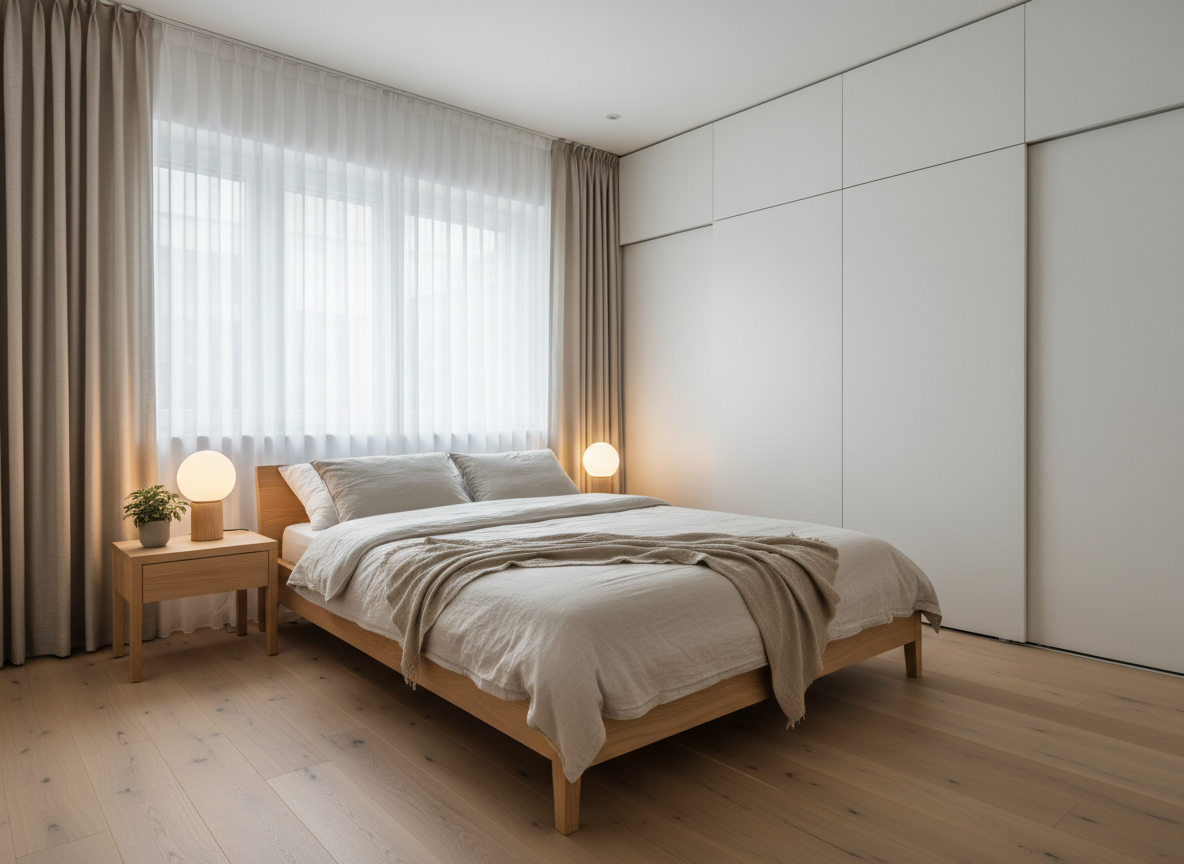 Rèm 2 lớp màu kem hoặc xám nhẹ.