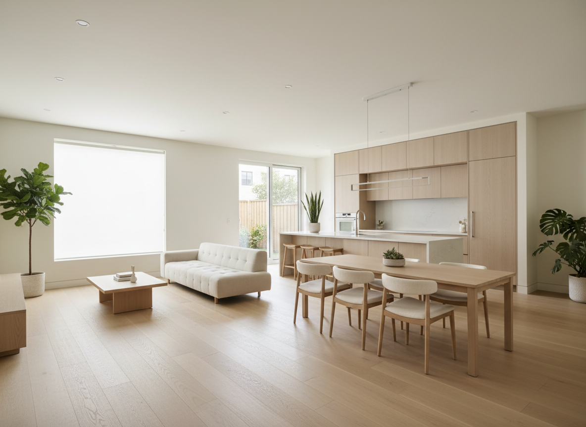 Sự kết hợp giữa tối giản Nhật Bản và Bắc Âu mang đến vẻ đẹp nhẹ nhàng, ấm áp và thanh lịch. Phong cách này sử dụng gỗ sáng, vải bố, gam màu kem – be – trắng, tạo cảm giác gần gũi, phù hợp với nhà phố Việt Nam. Đây là hướng thiết kế được nhiều gia đình trẻ yêu thích vì tính ấm áp và thân thiện.