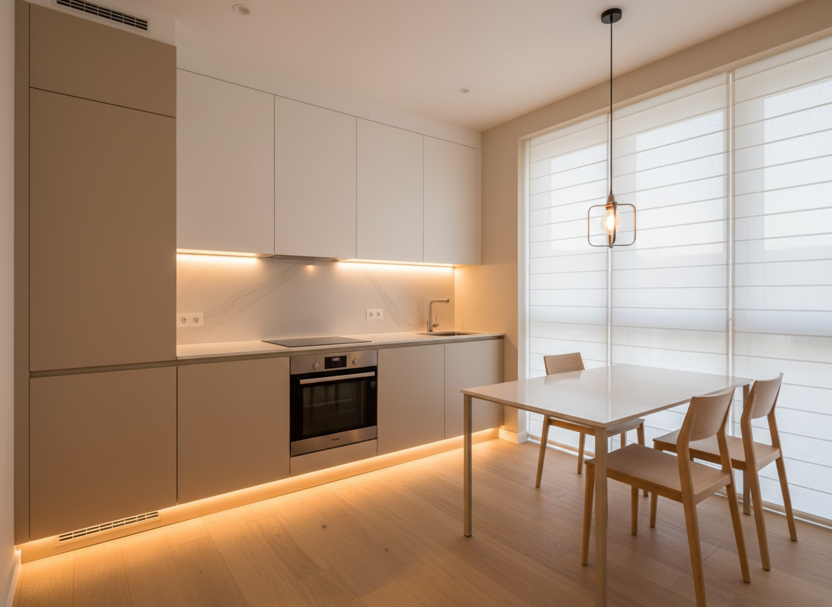 Ánh sáng nhân tạo cũng cần được tính toán chi tiết. Các hệ đèn downlight ánh sáng vàng dịu, kết hợp đèn LED dây hắt trần hoặc tủ kệ giúp không gian trở nên sang trọng và sâu hơn. Tại phòng khách và bếp, nên ưu tiên ánh sáng trung tính (4000K) để tạo sự hài hòa. Phòng ngủ thường dùng ánh sáng vàng để tạo cảm giác ấm áp và thư giãn. Hệ thống chiếu sáng phân lớp (layered lighting) gồm ánh sáng tổng – ánh sáng điểm – ánh sáng trang trí là bí quyết giúp căn nhà trở nên đẳng cấp và tối ưu diện tích.