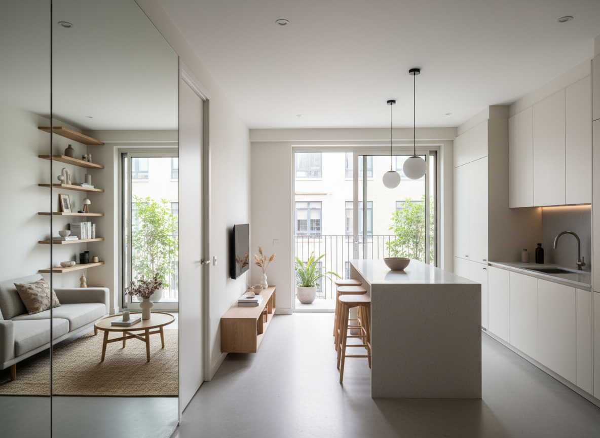 Gương giúp nhân đôi không gian, đặc biệt khi đặt tại phòng khách hoặc khu vực ăn uống. Sàn gỗ tông sáng hoặc gạch porcelain 60×60 màu kem cũng giúp không gian nhẹ nhàng và thông thoáng.