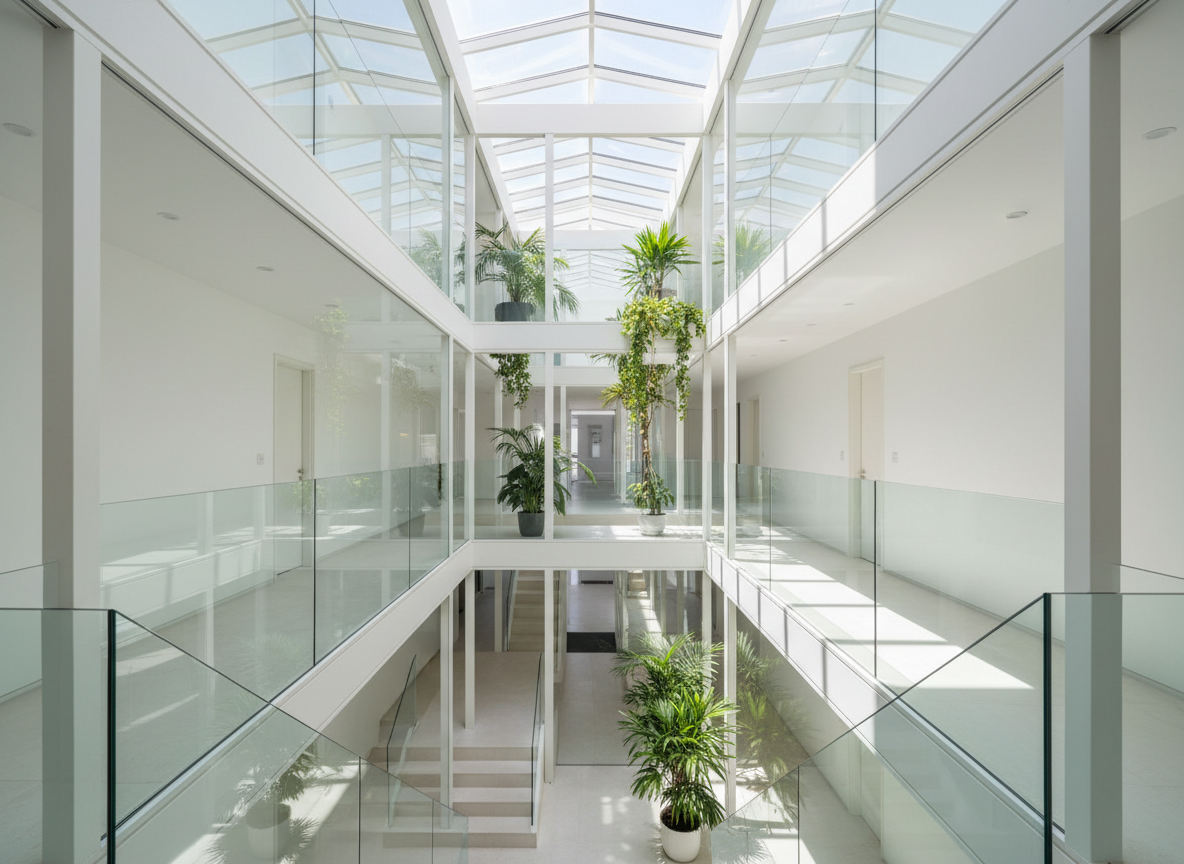 Một trong những yếu tố ảnh hưởng lớn nhất đến sự thoáng rộng của nhà phố chính là cấu trúc tổng thể. Nhà phố thường ít mặt thoáng nên việc bố trí giếng trời, khoảng thông tầng hoặc sân trước – sân sau là vô cùng quan trọng. Giếng trời giúp tăng cường ánh sáng tự nhiên, tạo sự đối lưu không khí và giảm cảm giác bí bách vốn là nhược điểm lớn của nhà phố liền kề. Kiến trúc sư thường khuyến khích thiết kế ít nhất 1–2 giếng trời tùy vào chiều dài của nhà, kết hợp cửa sổ khe đứng, ô lấy sáng và lam dọc để tạo cảm giác diện tích được kéo dài hơn.