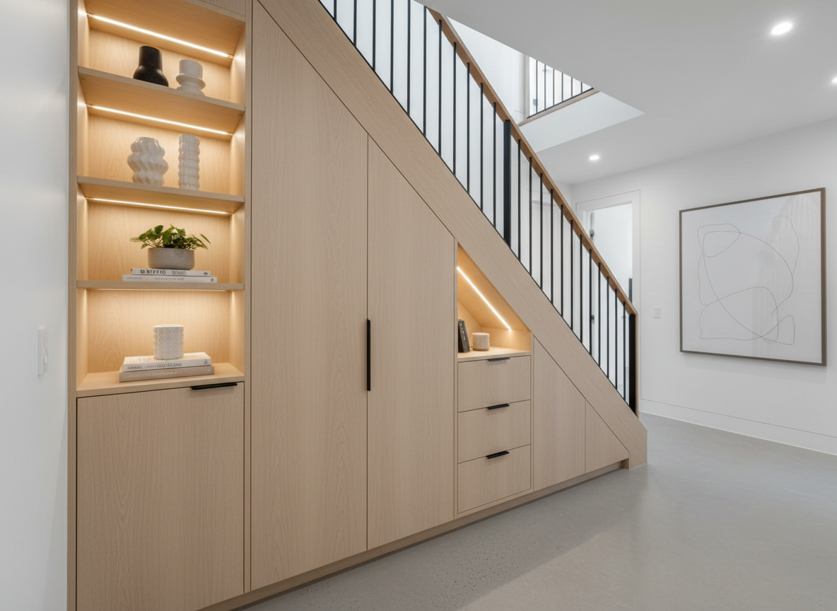 Đặc biệt, khu vực gầm cầu thang – vốn thường bị bỏ trống – có thể tận dụng làm tủ giày, tủ trang trí, hộc chứa đồ hoặc WC nhỏ tùy vào bố cục.