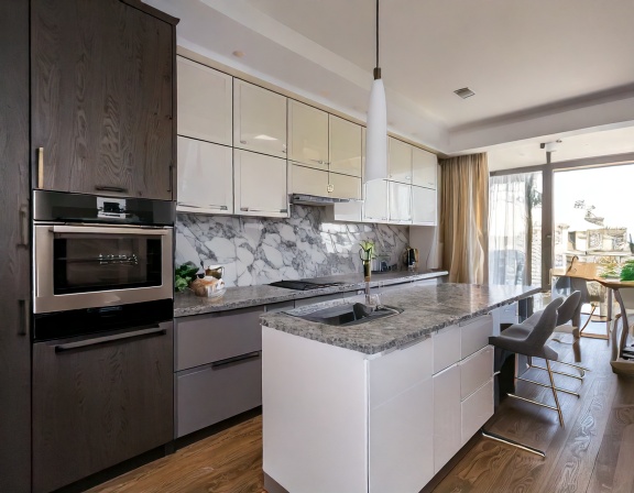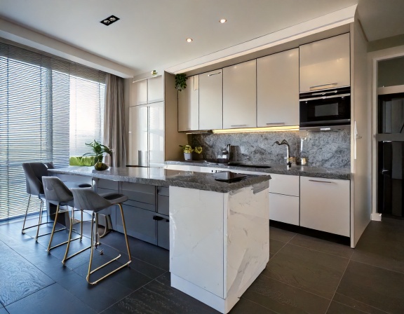 Với những gia đình yêu thích sự sang trọng, tủ bếp chữ I phong cách luxury sử dụng vật liệu cao cấp như Acrylic cao cấp, gỗ veneer tự nhiên, mặt đá thạch anh, kính ốp bếp cường lực màu khói hoặc vân đá. Hệ thống đèn LED âm tủ được bố trí tinh tế giúp không gian bếp nổi bật và đẳng cấp hơn.