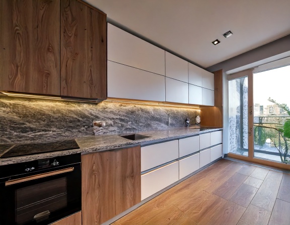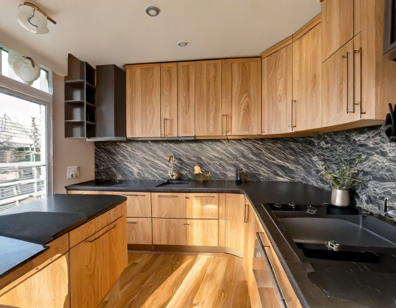Bên cạnh phần thùng tủ, vật liệu mặt bàn bếp cũng rất quan trọng. Thông dụng nhất là đá granite, đá marble và đá thạch anh nhân tạo. Mỗi loại đá có ưu điểm riêng về độ bền, khả năng chống trầy xước và tính thẩm mỹ.