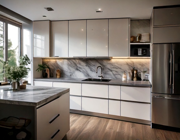 Ngoài ra, các mẫu Laminate bề mặt bóng gương, mờ lì hoặc vân đá marble cũng đang trở thành xu hướng trong những căn bếp cao cấp. Bề mặt bóng giúp phản chiếu ánh sáng tốt, tạo hiệu ứng sang trọng và hiện đại. Trong khi đó, bề mặt mờ lại mang đến cảm giác tinh tế, hạn chế bám vân tay và dễ vệ sinh hơn trong quá trình sử dụng.
