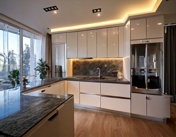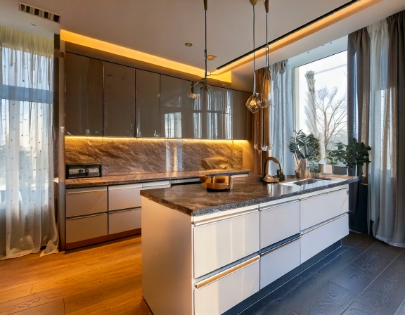 Về vật liệu, tủ bếp sang trọng thường sử dụng các loại gỗ công nghiệp cao cấp như MDF lõi xanh chống ẩm phủ veneer, laminate cao cấp, acrylic nhập khẩu hoặc kết hợp gỗ tự nhiên xử lý kỹ thuật cao. Mặt bàn bếp ưu tiên đá thạch anh nhân tạo, đá marble tự nhiên hoặc granite cao cấp với vân đá đẹp, độ bóng cao và khả năng chịu lực, chịu nhiệt vượt trội.