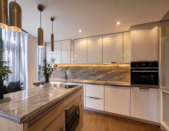 Mặt bàn bếp thường sử dụng đá thạch anh nhân tạo vì có độ cứng cao, chống thấm tốt, ít bám bẩn và màu sắc đa dạng. Đối với những không gian thật sự cao cấp, đá marble tự nhiên hoặc granite nhập khẩu sẽ giúp tủ bếp đạt đến đẳng cấp thượng lưu với những đường vân độc bản không trùng lặp.