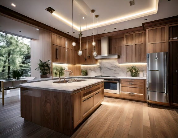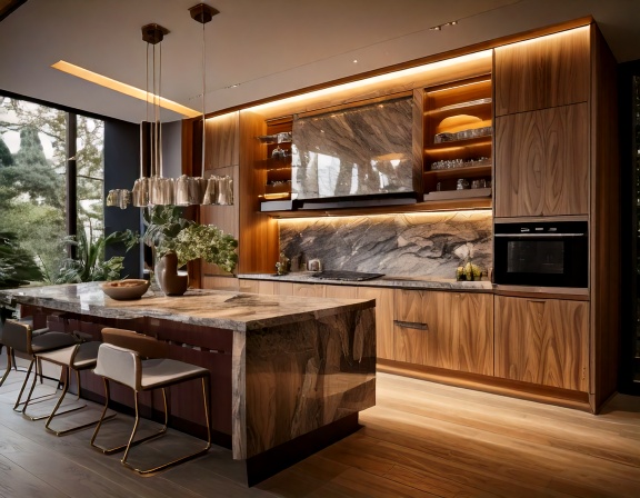 Phong cách luxury cao cấp hướng đến sự xa hoa và đẳng cấp vượt trội. Tủ bếp luxury thường sử dụng vật liệu đắt tiền như veneer óc chó, gỗ tự nhiên cao cấp, đá marble vân lớn, kết hợp chi tiết kim loại mạ vàng, inox mạ titan hoặc kính màu. Thiết kế chú trọng tính đối xứng, tỷ lệ chuẩn, tạo cảm giác sang trọng ngay từ cái nhìn đầu tiên. Đây là phong cách rất được ưa chuộng trong các căn biệt thự, penthouse, nhà phố cao cấp.