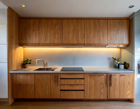 Phổ biến nhất là các mẫu tủ bếp phong cách tối giản hiện đại, sử dụng màu trung tính như trắng, xám, be, vân gỗ nhạt. Thiết kế phẳng, tay nắm âm hoặc không tay nắm giúp không gian bếp gọn gàng, dễ vệ sinh và không lỗi thời theo thời gian.