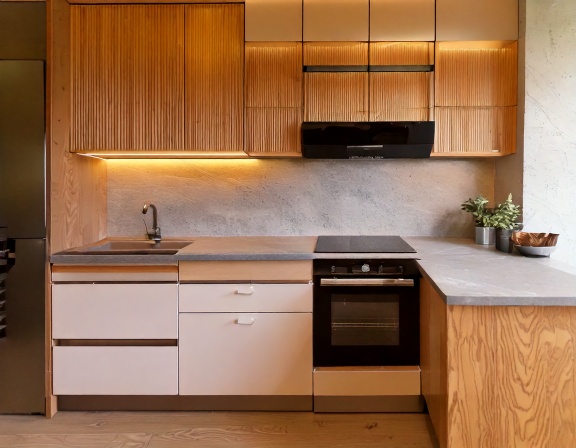 Yếu tố đầu tiên ảnh hưởng lớn nhất đến giá là vật liệu cốt tủ và bề mặt hoàn thiện. Các dòng tủ bếp xuất khẩu Nhật Bản sử dụng plywood, MDF chống ẩm chuẩn E0/E1, kết hợp sơn cao cấp hoặc laminate, acrylic đạt chuẩn quốc tế. Vật liệu càng cao cấp, quy trình xử lý càng kỹ thì chi phí càng tăng, nhưng đổi lại là độ bền và độ an toàn lâu dài.
