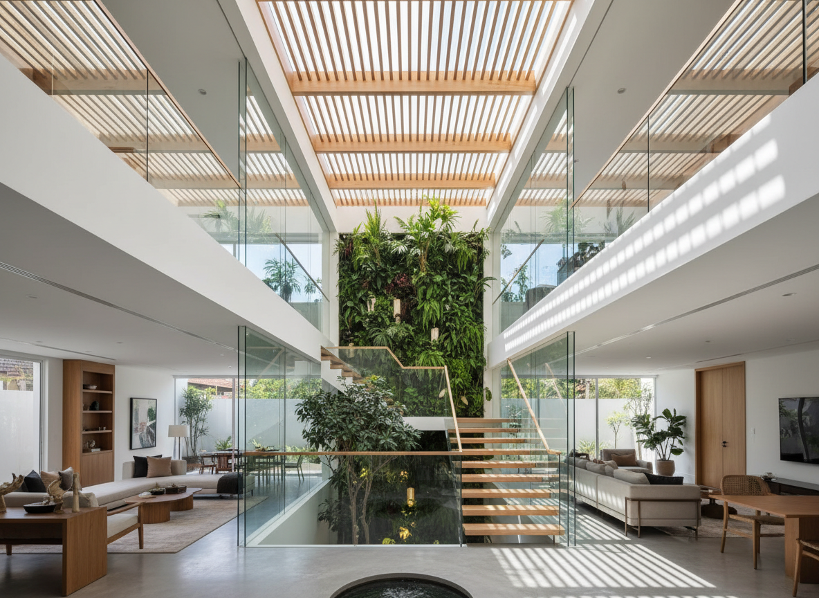 Một xu hướng quan trọng khác trong thiết kế nội thất nhà phố là đưa thiên nhiên vào không gian sống. Không gian xanh giúp cân bằng cảm xúc, thanh lọc không khí và tạo dấu ấn thẩm mỹ độc đáo. Các vị trí phổ biến gồm giếng trời, ban công, sân sau, tường cây xanh, tiểu cảnh nước, giàn dây leo hoặc nội thất gỗ tự nhiên kết hợp ánh sáng tự nhiên. Đặc biệt, giếng trời không chỉ giúp lấy sáng – lấy gió mà còn tạo hiệu ứng không gian cực kỳ ấn tượng, nâng cao giá trị tổng thể của ngôi nhà.