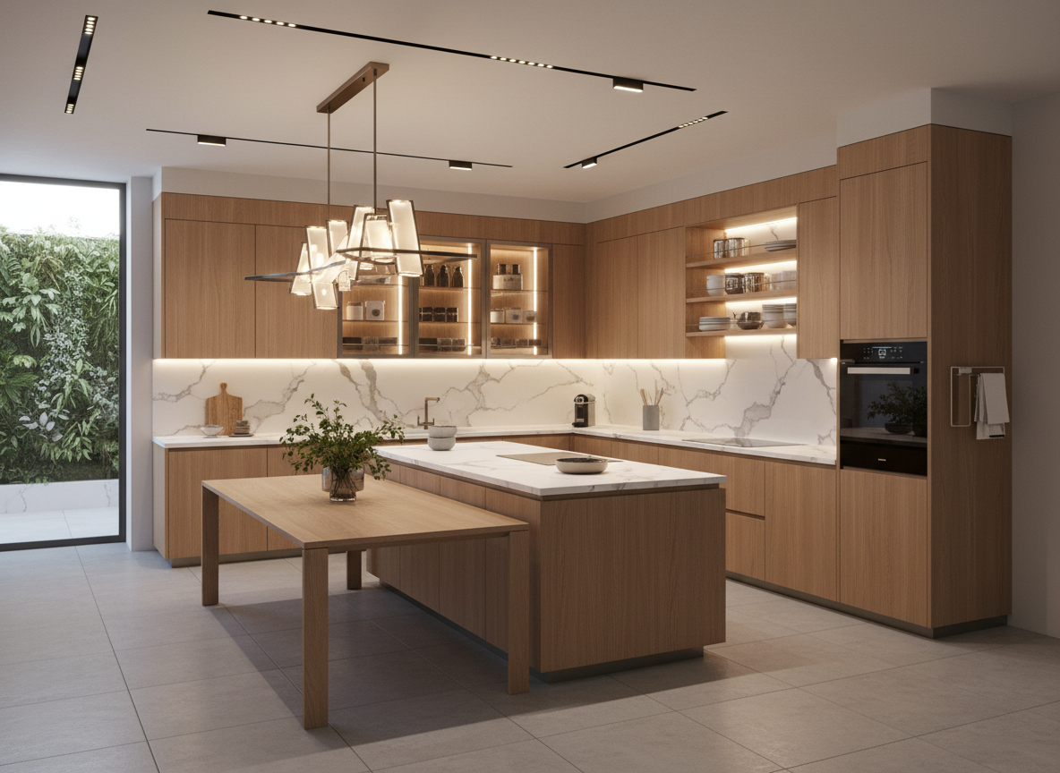 Phòng bếp lại đặt trọng tâm vào tủ bếp chữ L hoặc chữ U, tích hợp kho khô, hệ phụ kiện thông minh như mâm xoay, ray giảm chấn, giá bát nâng hạ. Mặt bếp thường dùng đá quartz trắng vân mây để tạo sự sạch sẽ và sang trọng. Đèn thả bàn ăn và bố cục gọn gàng giúp không gian trở nên ấm cúng và đẹp mắt.