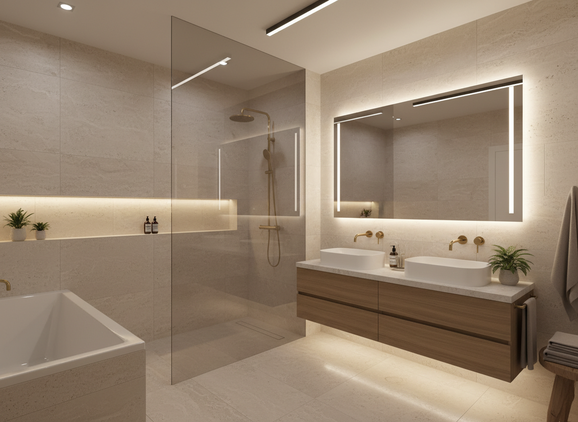 Không gian vệ sinh tại các nhà phố hiện đại đang được đầu tư mạnh với thiết kế giống khách sạn hoặc spa mini. Vật liệu ốp lát ưu tiên đá sáng màu, gạch terrazzo, kính cường lực phân khu khô – ướt, tủ lavabo chống ẩm và hệ đèn LED tạo chiều sâu. Việc sử dụng sen tắm âm tường, lavabo treo, phụ kiện inox 304 giúp không gian sang trọng hơn mà vẫn dễ vệ sinh.