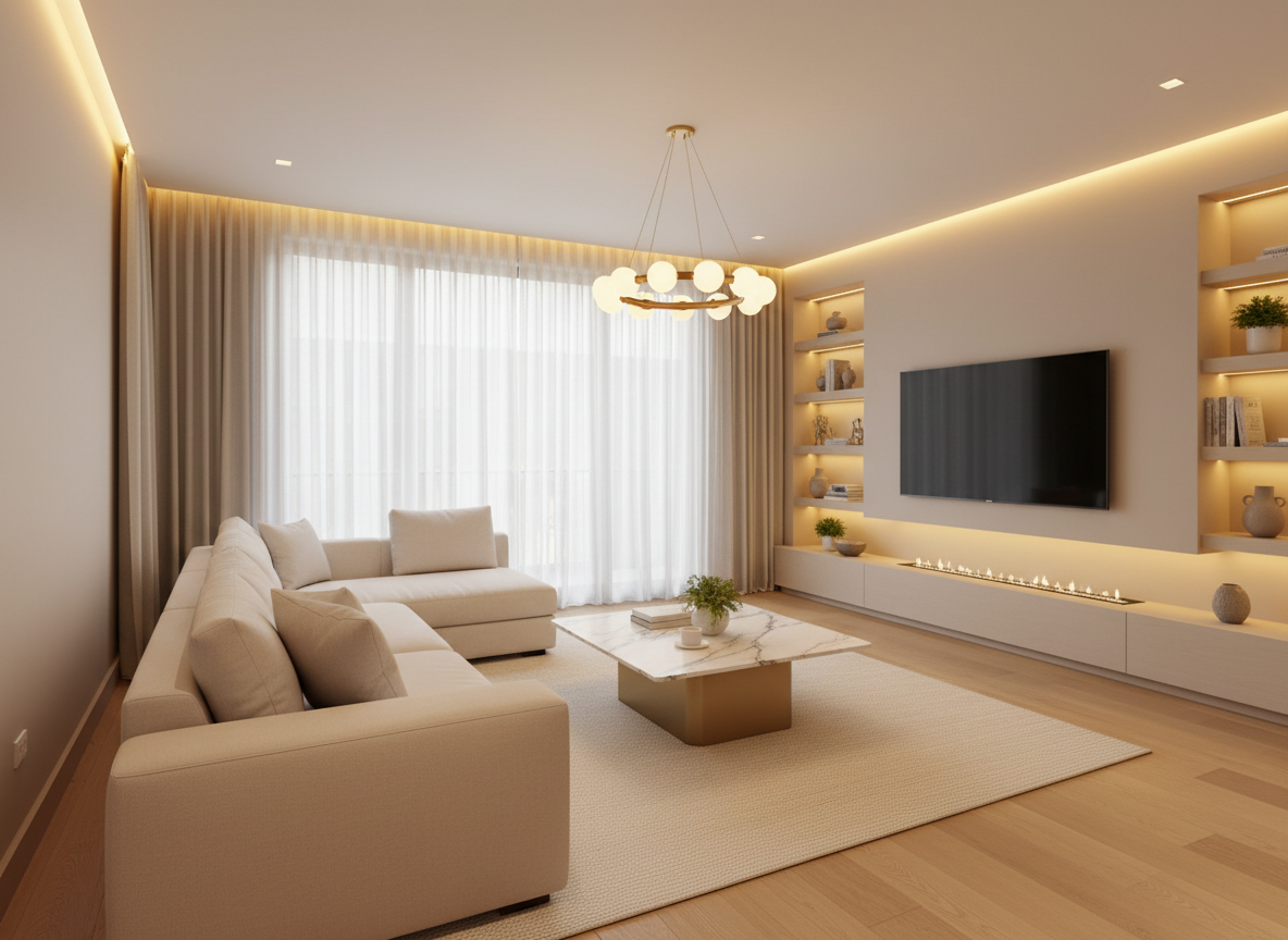 Trong phòng khách, xu hướng mới hướng đến sự tối giản nhưng sang trọng, chú trọng bố cục ngang rộng, hạn chế chi tiết thừa. Kệ tivi kết hợp hệ vách gỗ, ốp PVC giả đá hoặc đá nhân tạo cao cấp đang được ưa chuộng mạnh. Sự kết hợp giữa ánh sáng vàng ấm và ánh sáng trắng thông minh giúp không gian trở nên linh hoạt: vừa sáng sủa khi tiếp khách, vừa thư giãn khi cần nghỉ ngơi.